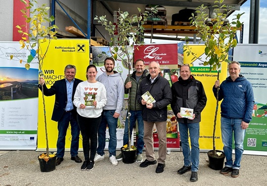 | Diesem Ziel ist man mit der diesjährigen Baumausgabe am 27. Oktober 2025 in Eberndorf wieder einen Schritt näher gekommen. Insgesamt konnten rund 400 hochstämmige Obstbäume - Äpfel, Birnen, Zwetschken - an mehr als 120 Südkärntner Haushalte ausgegeben werden. Baumpflanzungen sind auch für die Klimawandelanpassung ein wichtiger Baustein. Deshalb wurde diese Aktion auch von der KLAR!-Region Südkärnten durch Bereitstellung von Helfern unterstützt. Herzlichen Dank an die Kooperationspartner Raiffeisenbank Eberndorf und Lagerhaus Wolfsberg. |