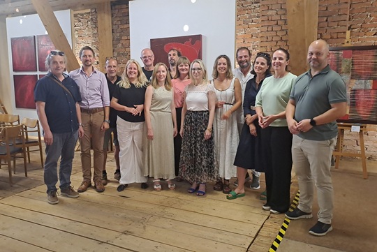 | Im Rahmen des Projektes traf sich auch erstmalig der regionale Kulturbeirat, der sich zur Aufgabe gemacht hat, das Projekt zur Entwicklung eines Kulturnetzwerkes fachlich und inhaltlich zu begleiten. Unter herrlichen sommerlichen Wetterbedingungen fanden die Teilnehmer:innen ausreichend Zeit, einerseits eine Führung durch die Räumlichkeiten des Container 25 und die Ausstellung von Karin Rupacher zu besuchen und andererseits bei einem Had’nrisotto und erfrischenden Getränken zu plaudern und sich fachlich auszutauschen. Die Ziele des Projektes betreffen eine digitale Kulturplattform, die Schaffung einer gemeinsamen Dachmarke und den Aufbau einer langfristigen Organisationsstruktur, um Unterkärnten als Kulturregion besser zu positionieren. |